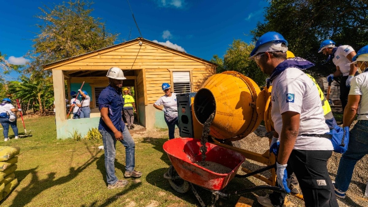 Voluntarios del Banco Popular Dominicano, en alianza con Hábitat para la Humanidad República Dominicana, construyeron pisos de concreto en cinco viviendas y remodelaron una cancha deportiva en la comunidad de Duzón, municipio de Yaguate.