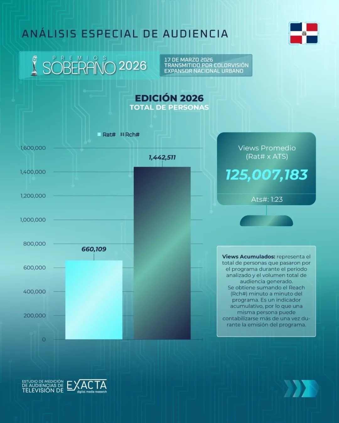 De acuerdo a Exacta Digital Media Research, firma de origen chileno especializada en la medición de audiencias multiplataforma en Latinoamérica -incluyendo televisión (rating) y medios digitales-, la gala alcanzó cifras extraordinarias. La empresa, que opera oficialmente en mercados como República Dominicana y Guatemala y utiliza tecnología de punta como Audio Matching para ofrecer datos precisos, certificó a través de su cuenta de Instagram el alcance obtenido por el evento.